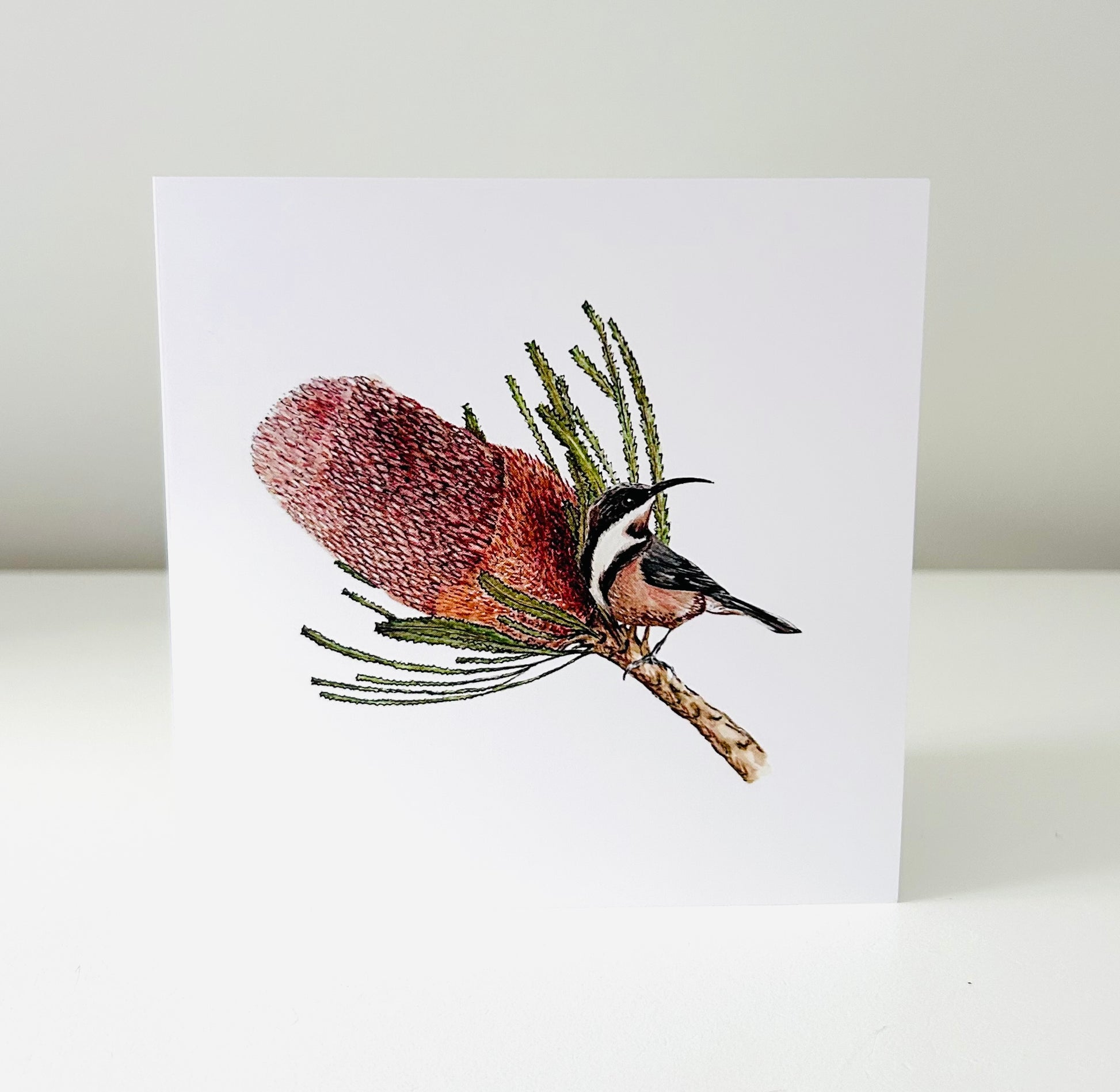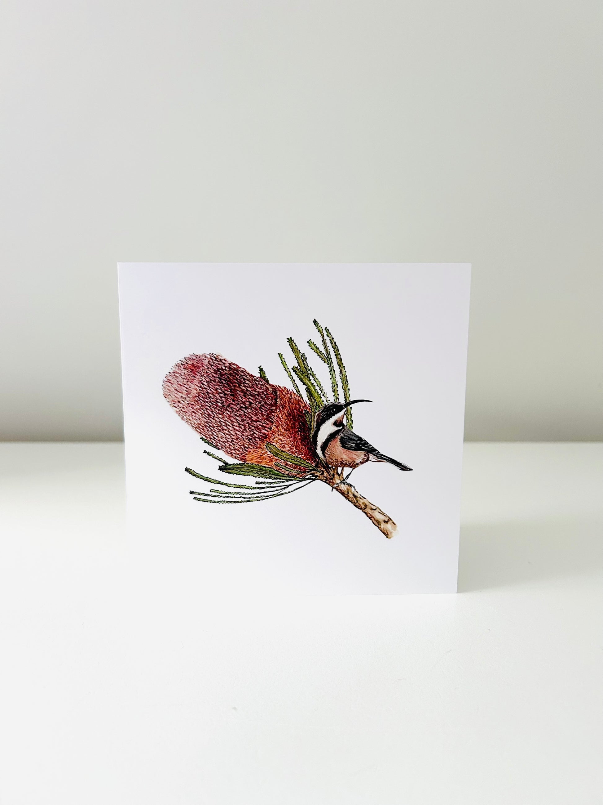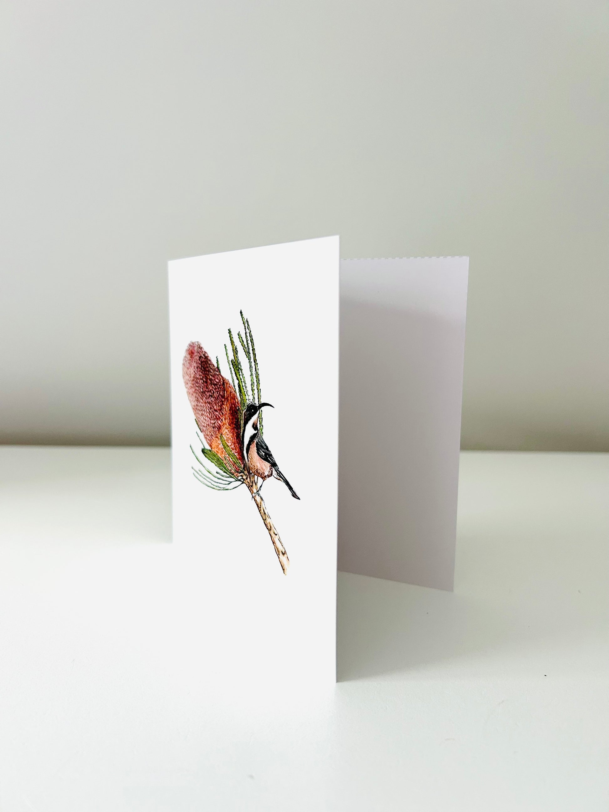 14cm x 14cm high quality print card, blank inside, cards are packaged in plant based cello sleeves with a white envelope.
