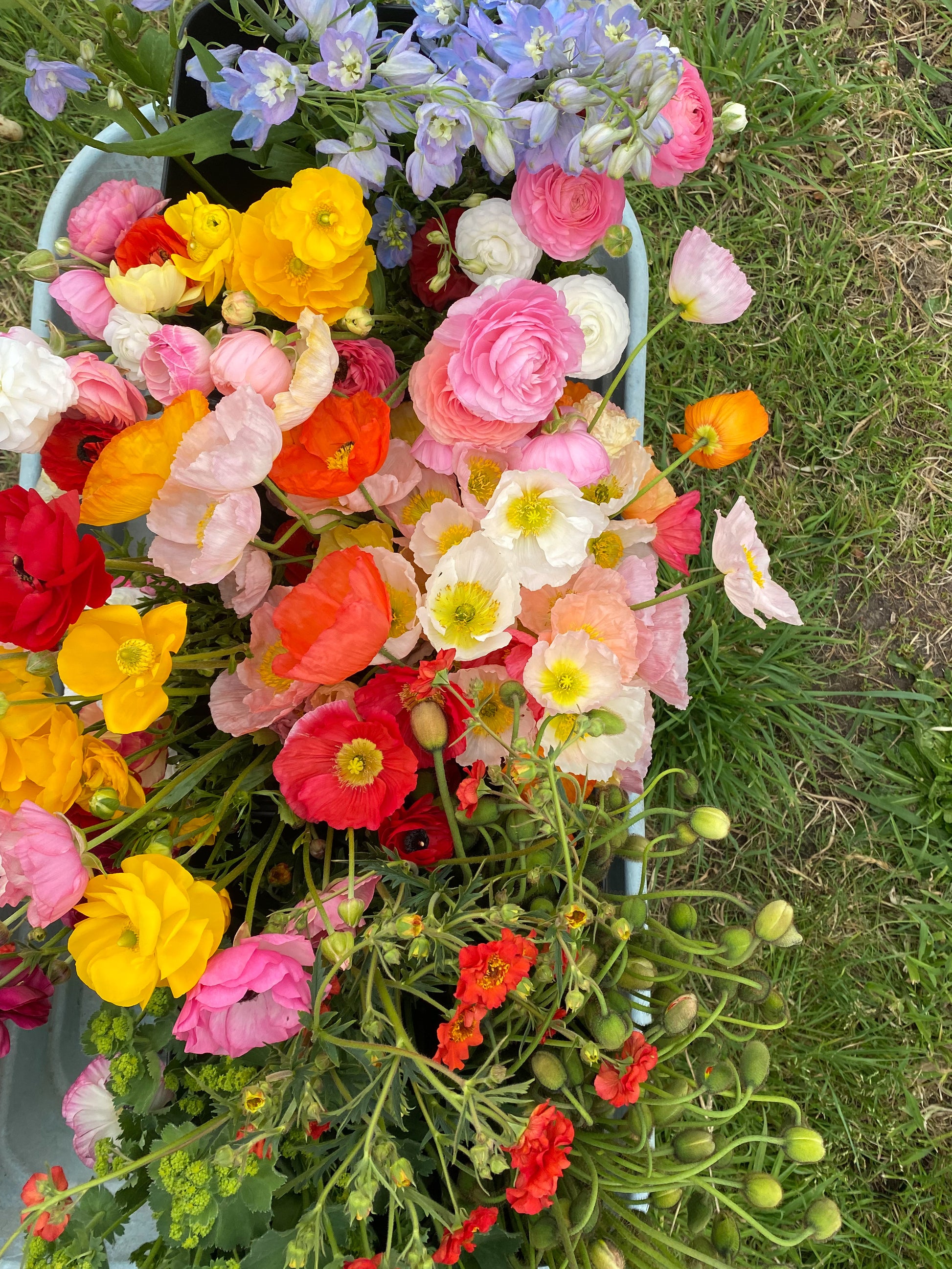 Buckets can be supplied, however we love to minimise unnecessary waste and plastic as often as possible, so we'll be thrilled to see you arriving with your own buckets/vases/jars or left out for us to place your blooms into at the time of delivery.