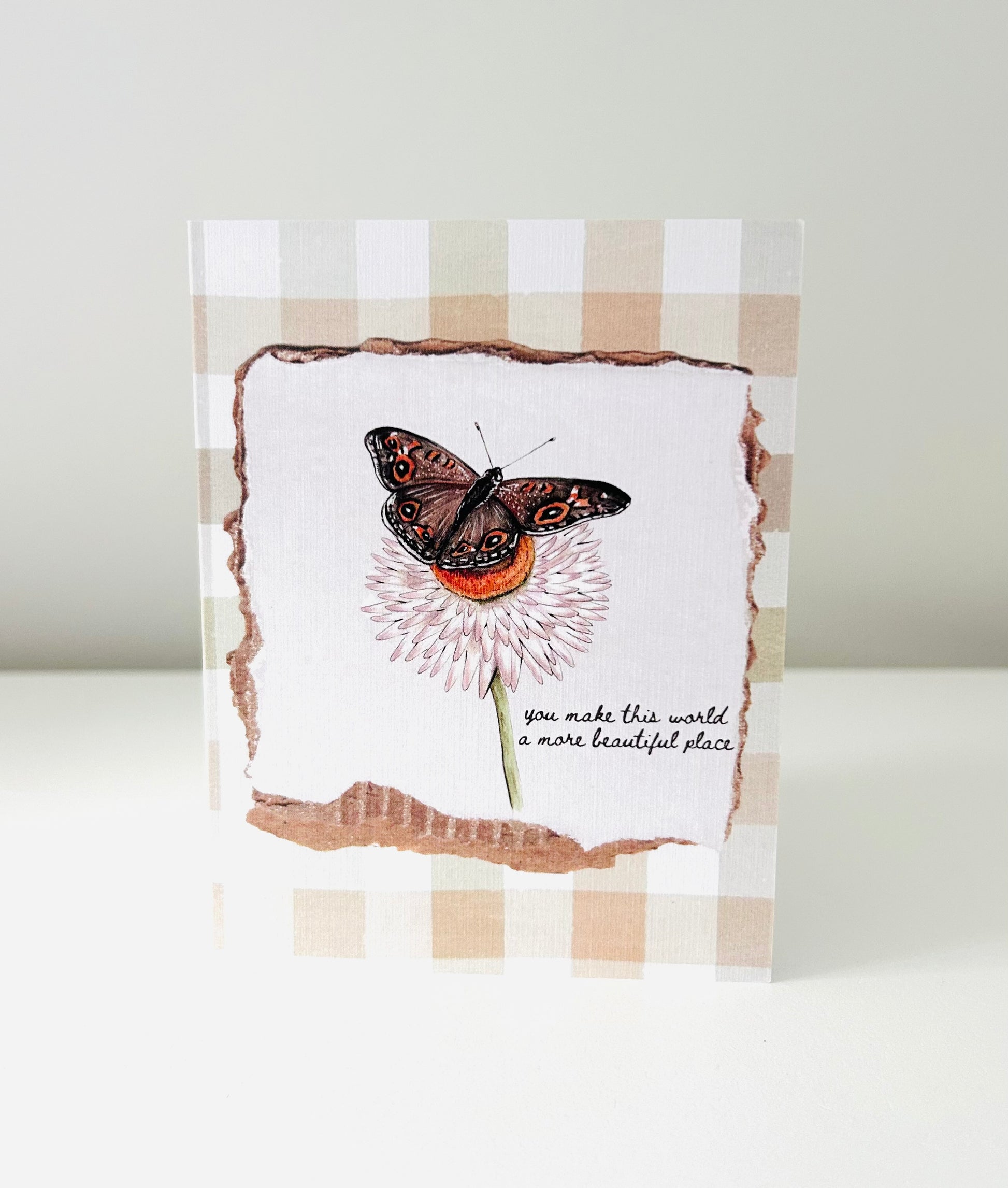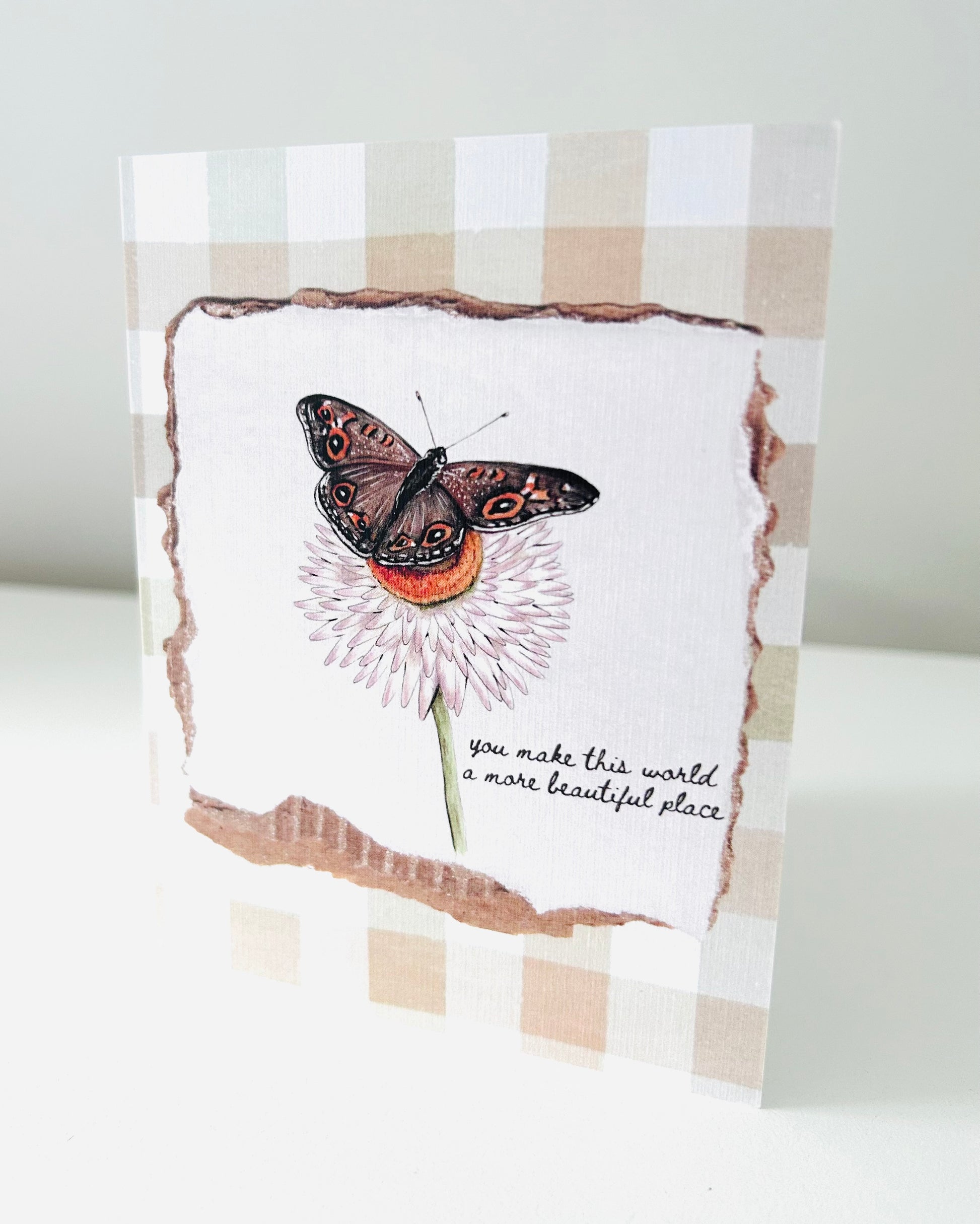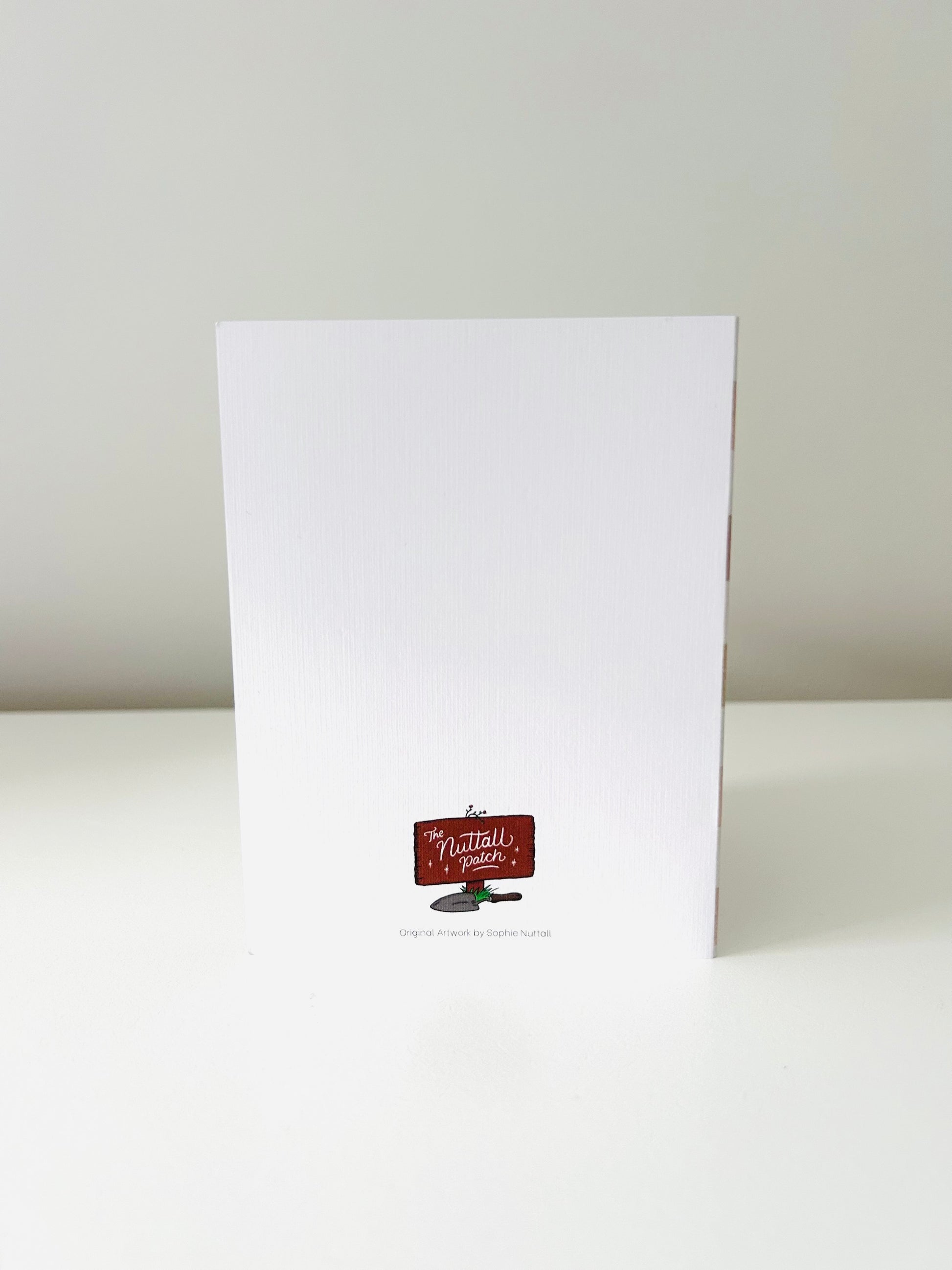 High quality print on cotton linen card stock, blank inside, packaged in plant based cello sleeves and with matching white envelope.