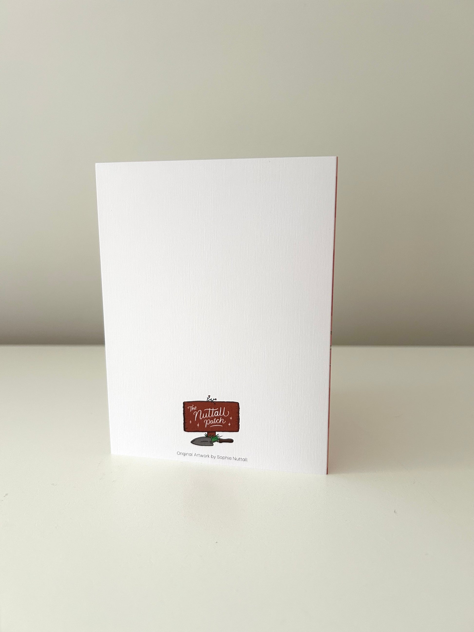 High quality print on cotton linen card stock, blank inside, packaged in plant based cello sleeves and with matching white envelope.