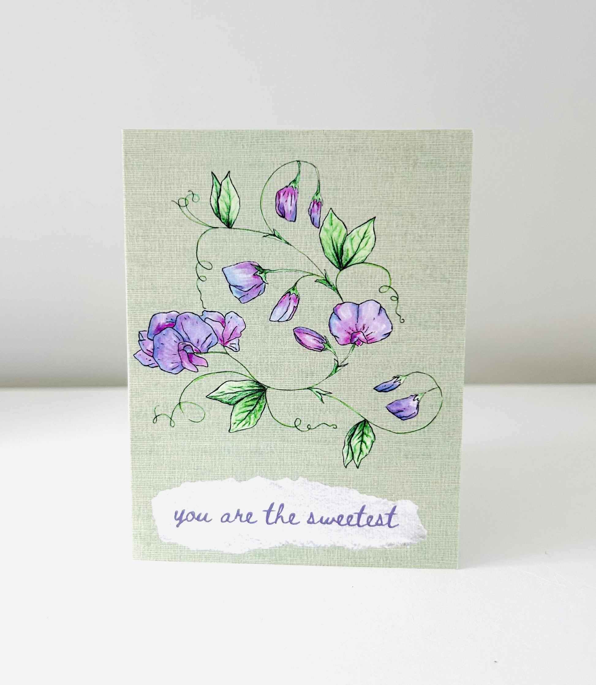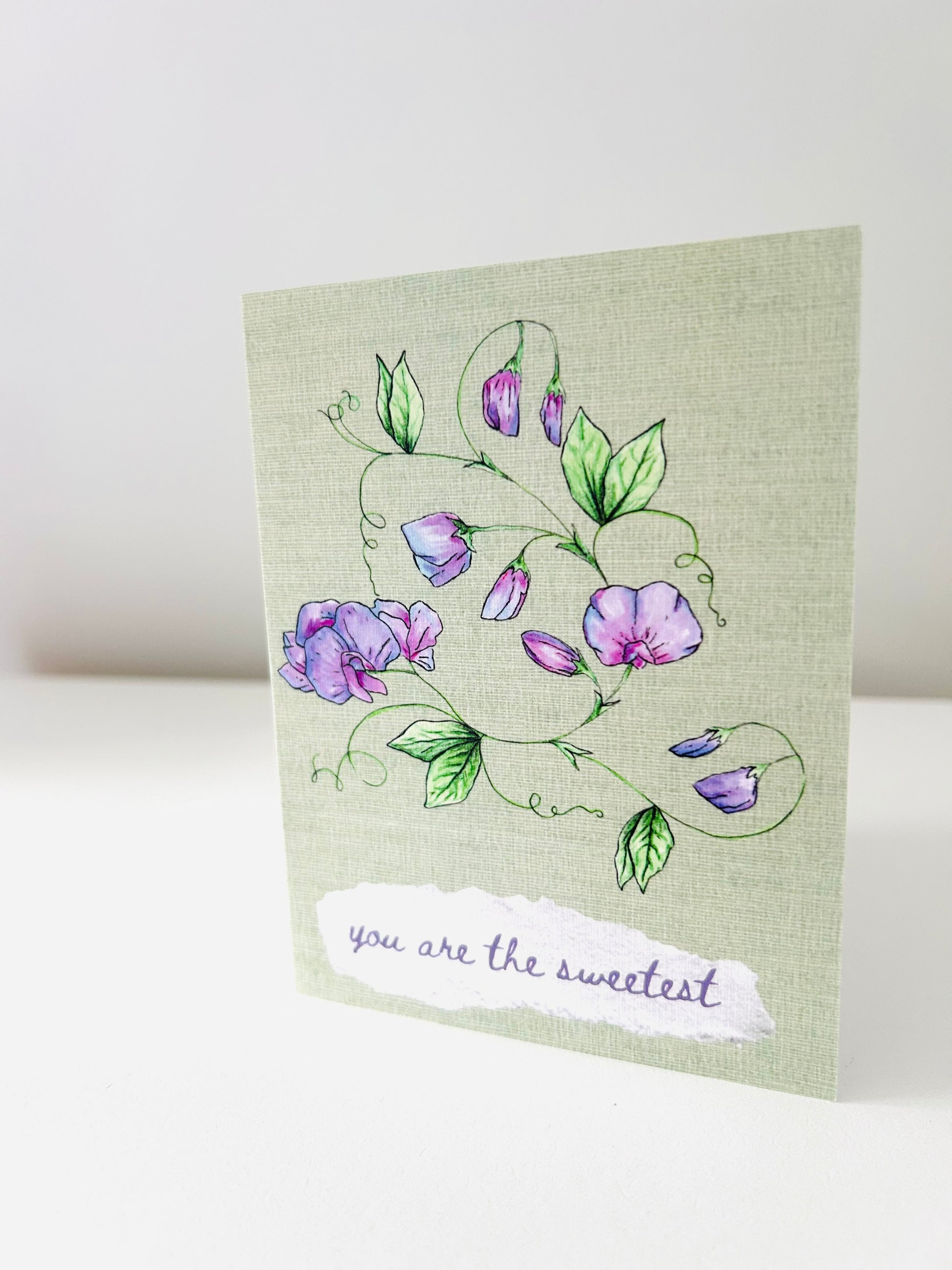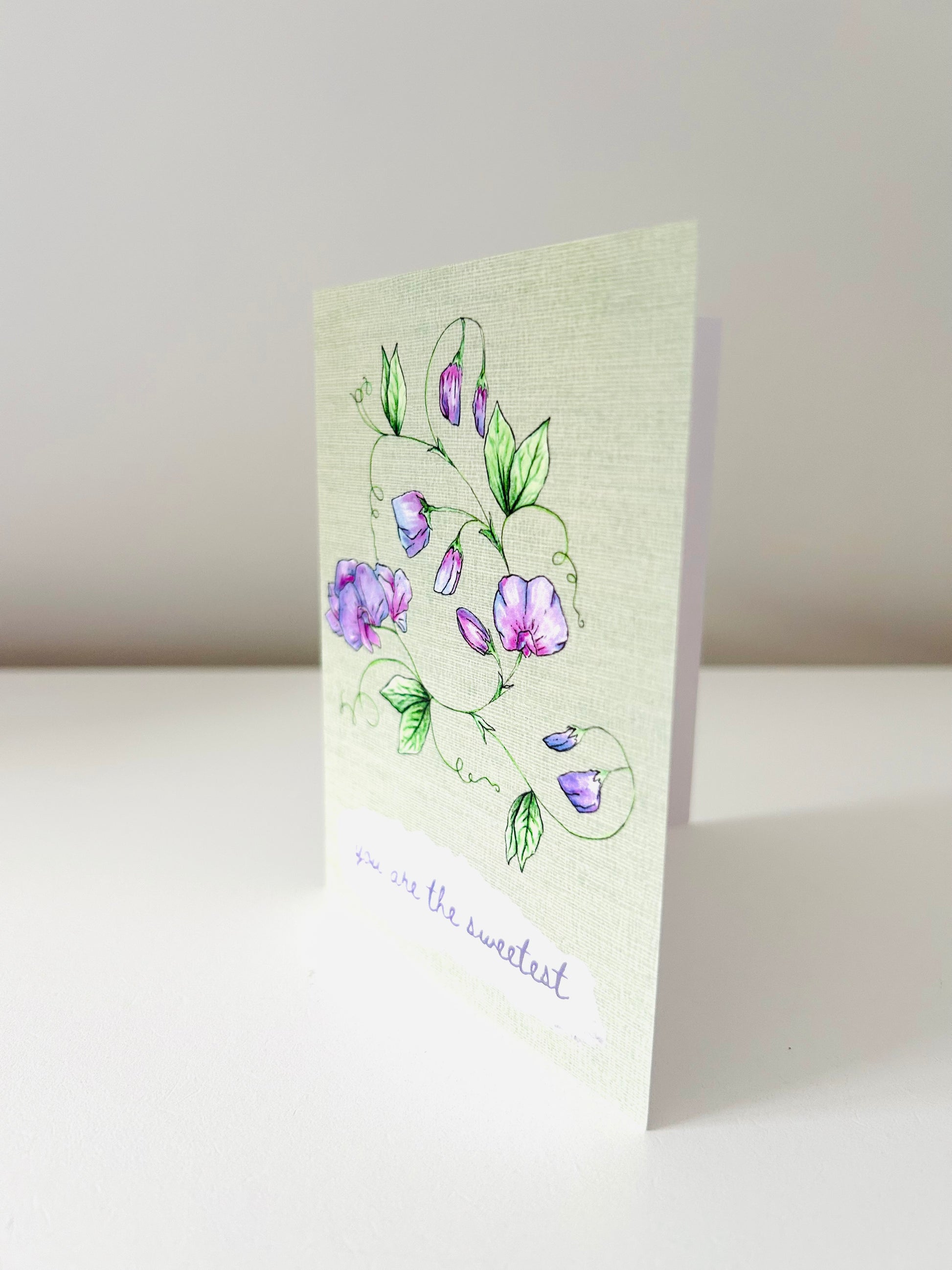 High quality print on cotton linen card stock, blank inside, packaged in plant based cello sleeves and with matching white envelope.