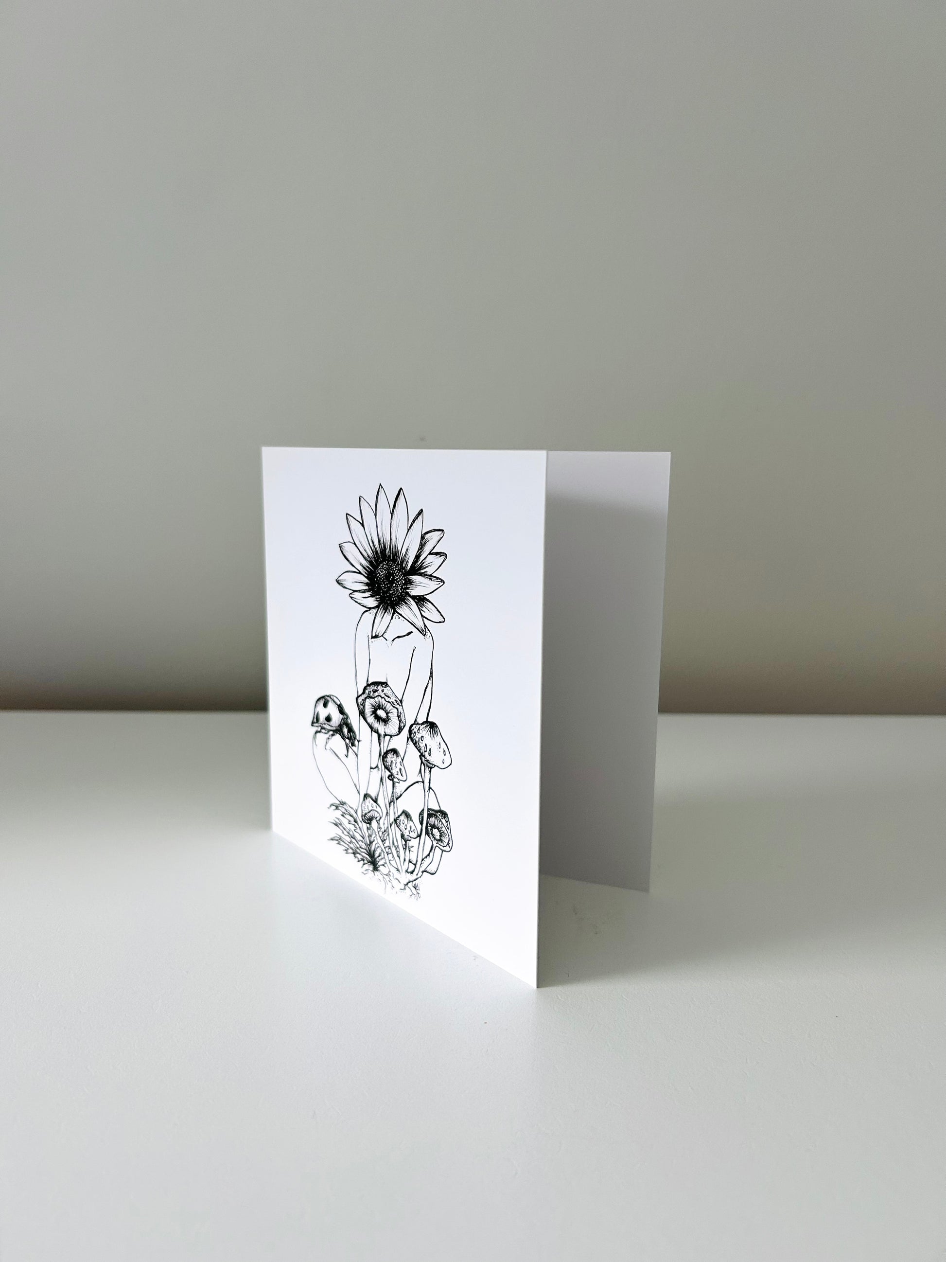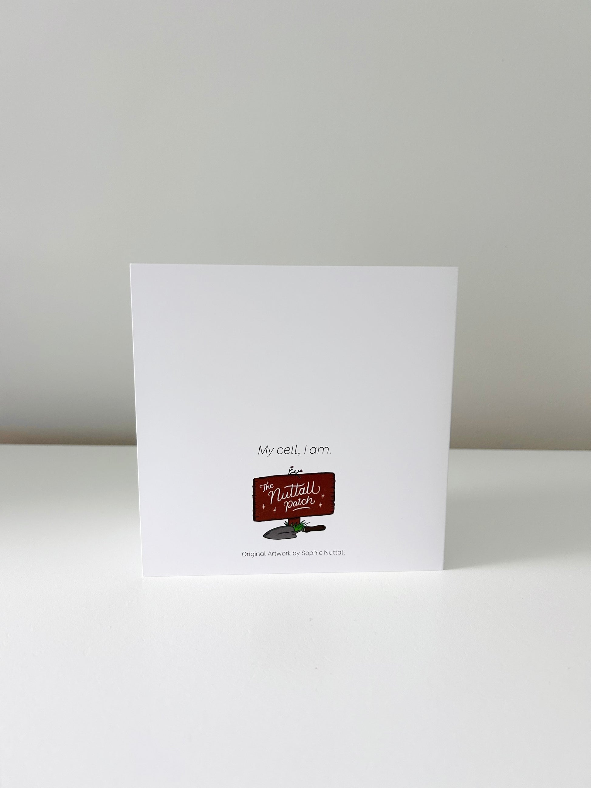 14cm x 14cm high quality print card, blank inside, cards are packaged in plant based cello sleeves with a white envelope.