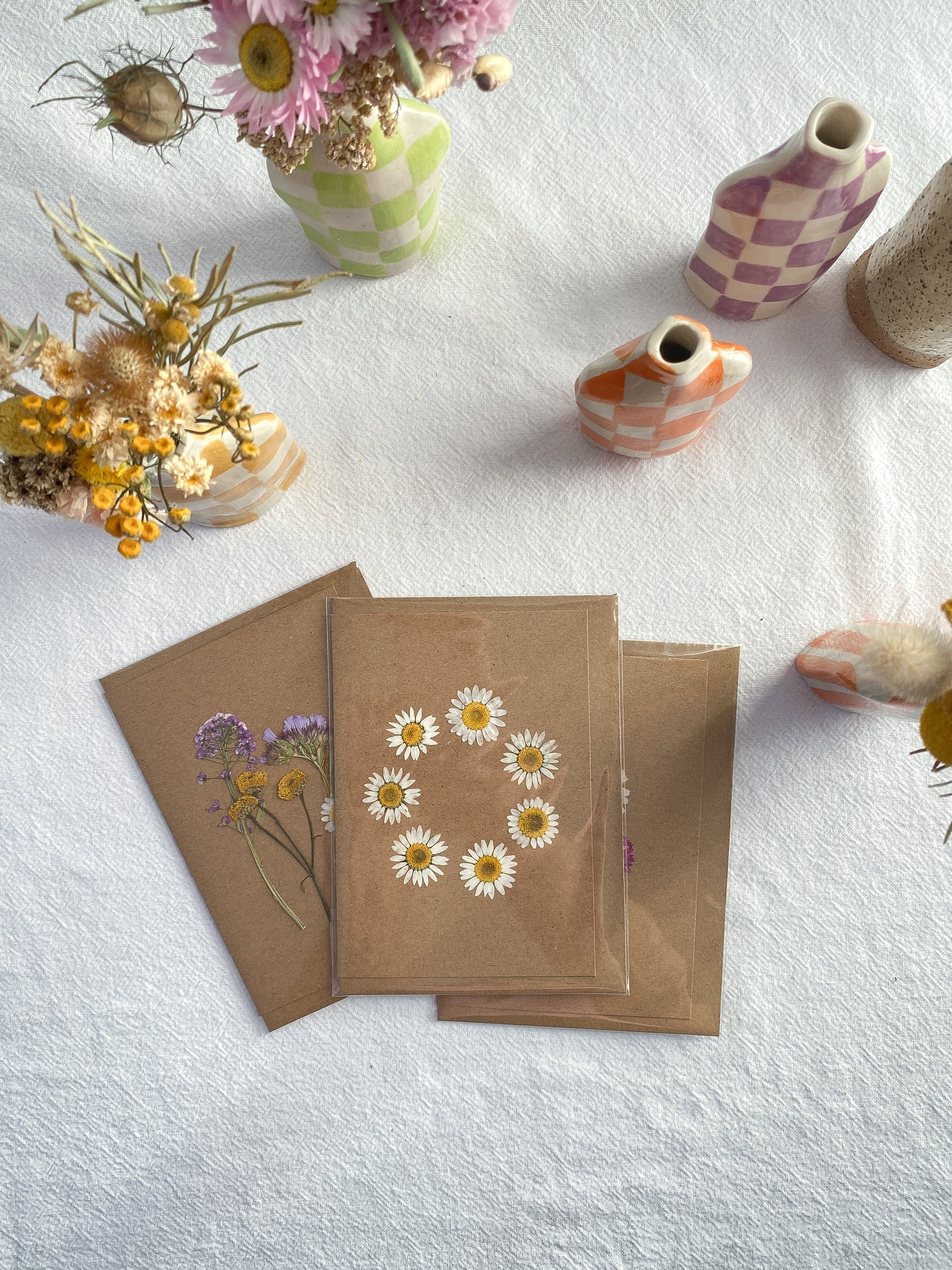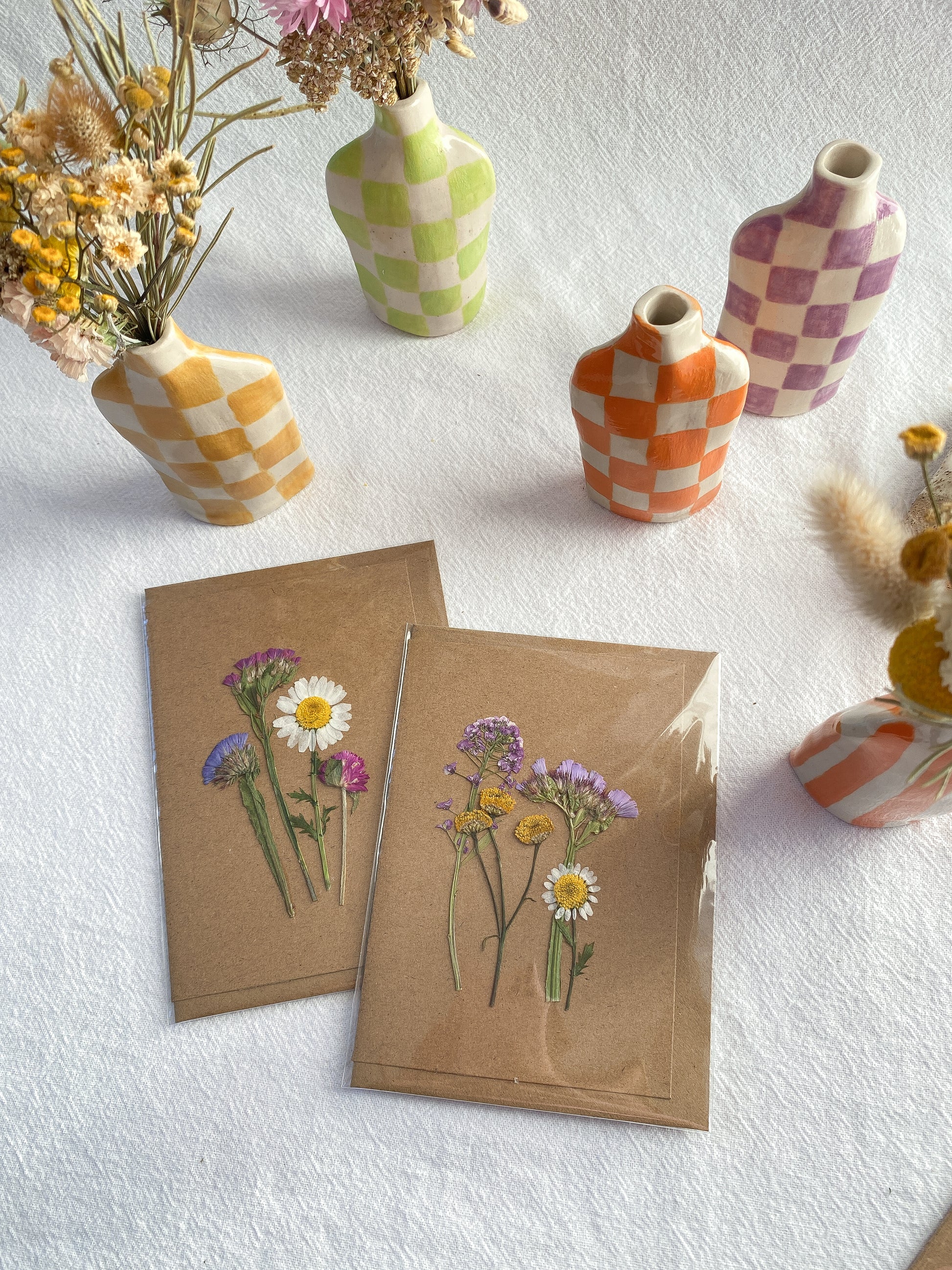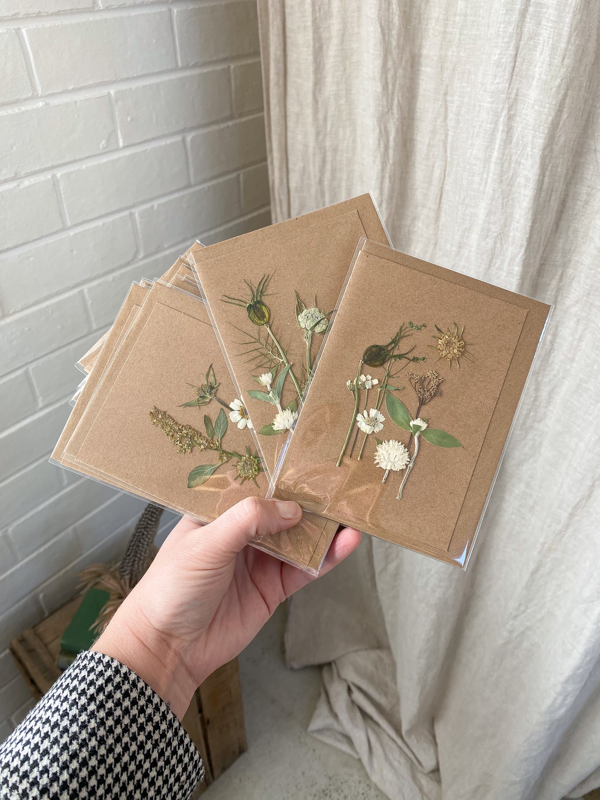 Grown and collected by us or responsibly foraged, we preserve our blooms in paper lined presses, wait and then thoughtfully design each card.